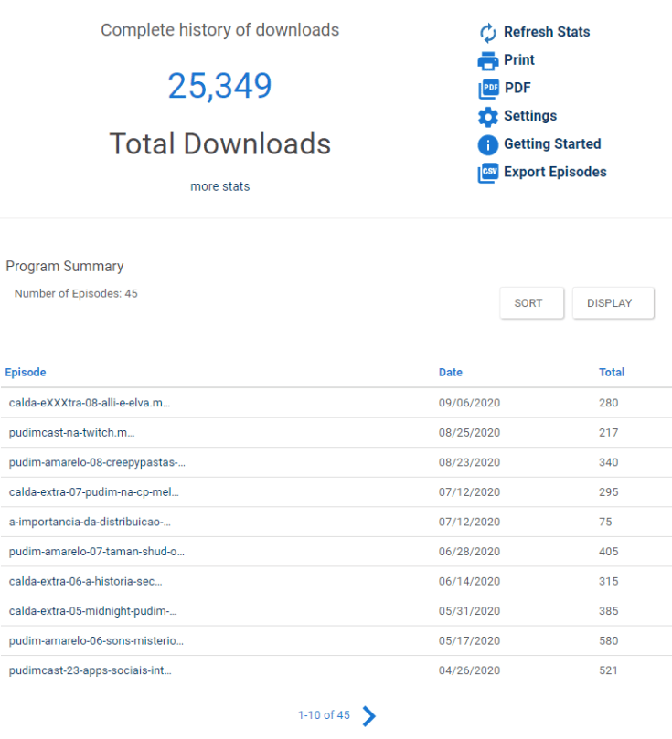 E ainda mais: Depois de reivindicar a propriedade no Castbox, ele passa a exibir suas estatísticas, ou seja, quantos downloads foram feitos nele, picos de downloads, downloads em determinados períodos, etc. Daí a usar uma métrica para analisar esses dados, é outra história.